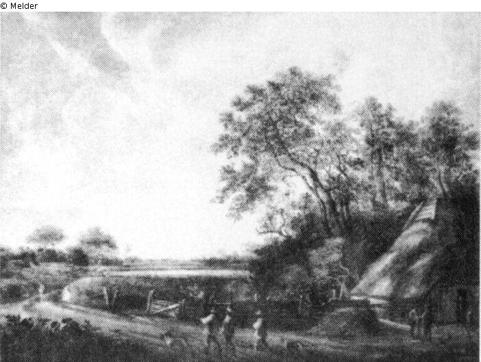 To the right beneath a group of trees is a dwelling with a high thatch. In the foreground along a road are three hunters with two hunting dogs.