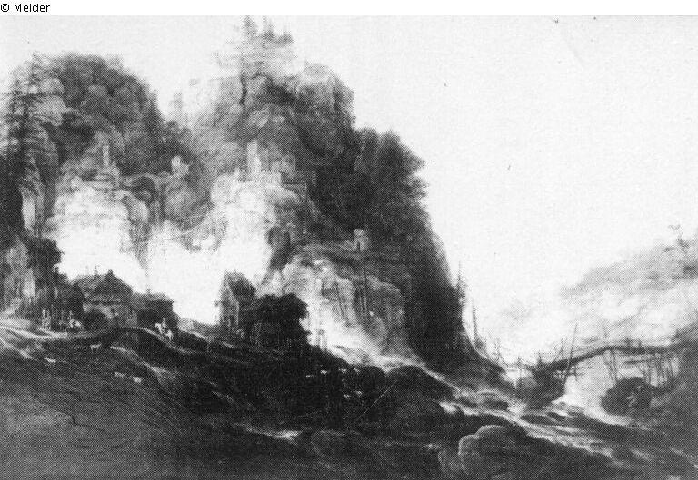 Composition with three coulisses in the form of tall forested cliffs. To the left are country houses a waterfall beyond, a wooden bridge to the right.