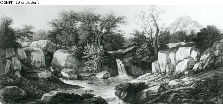 Tafelmalerei: Bild & Supraporte: Wasserfall & Felsformationen & Baumgruppen