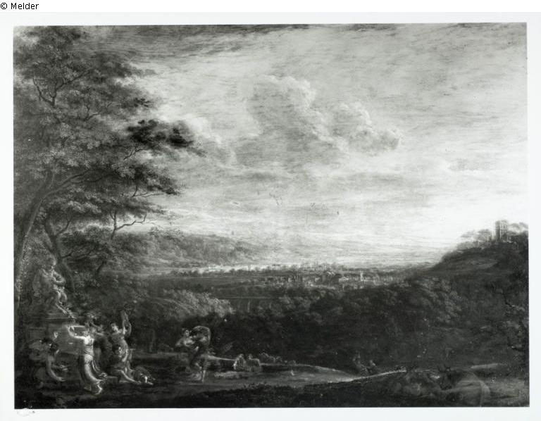 Kat. der Städtischen Kunst- und Gemäldesammlung in Bamberg 1900, Nr. 341. - Unter einer Baumgruppe vorne links steht eine Panstatue, welcher ein Hirtenmädchen Milch, Früchte und Blumen opfert. Ein Mädchen schlägt das Tamburin, ein Knabe bläst die Flöte und ein Paar tanzt. Rechts vorne Weidvieh. Aussicht auf eine ferne Stadt und ein Tal (Inventarbeschreibung).