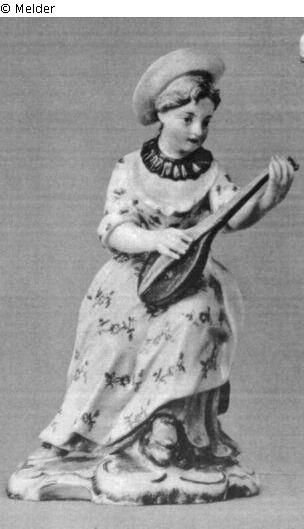 Sie sitzt auf einer schokoladenbraun staffierten Steinbank mit grünem Rasenbelag und spielt die auf ihrem Schoß ruhende Laute. Der linke Fuß steht auf einem Stein, der rechte Fuß ist zur Seite gesetzt. Sie trägt einen strohgelben, in den Nacken gezogenen Hut, schwarze Halskrause, weißes, rot und hellgrün gemustertes Mieder, kleistergrauen, violett geblümten Rock und gelbe Schuhe mit roten Schleifen. Unter dem hochgeschlagenen Rock ist der purpurne Unterrock sichtbar. Der mit grünem Gras bemalte weiße Sockel ist mit golden und purpurn staffierten Rocaillen eingefasst. Marke, mit dem Blindstempel eingedrückt: PH. Ritzzeichen: 3.