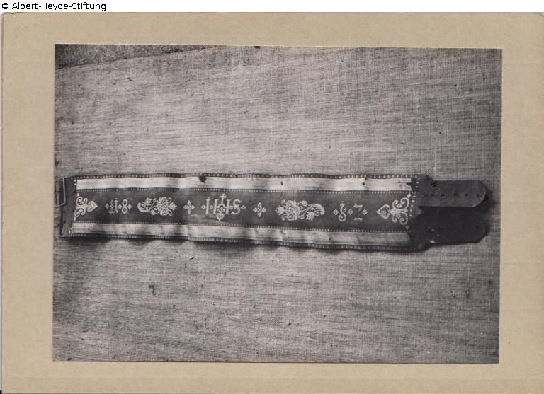 Bestickter Ledergürtel mit Messingschnalle. Silberstickerei mit Planzenornamenten, dem Christus-Monogramm "IHS" und dem Datum "18 / 12". Inschrift auf der Rückseite: „Diesen Gürtel hat Riegl der Adjutant des unglücklichen Hoffert im Tyroler befreyung Kriege getragen“.
