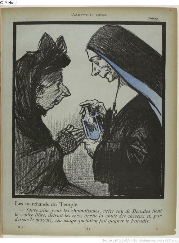 "Eine Nonne als Tempelhändlerin im Kundengespräch mit einer Witwe, der sie ein Wundermittel vergleichbar dem bekannten Klosterfrau Melissengeist anbietet. Eduard Fuchs hat diese Verkaufsstrategie übersetzt: ‚Der beste Witwentrost: Dieses Wasser fördert die Verdauung, reinigt den Magen, bewahrt den Schlaf vor unruhigen Träumen, verleiht eine frische und gesunde Gesichtsfarbe, und durch einen Kauf erwirbt man überdies völligen Sündenablass für die Seele eines Verstorbenen.‘ Steinlen bezieht sich hier auf die im neuen Testament geschilderte Austreibung der Händler aus dem Tempel durch Jesus." (UW)