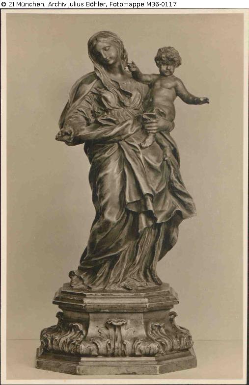 Stehend, auf dem linken Arm das Kind, dieses mit weit ausgebreiteten Armen. Rechte Hand der Madonna ergänzt. Vollrund. Gebrannter Ton in Bronzetönung. Holzsockel. Unter italienischem Einfluss.