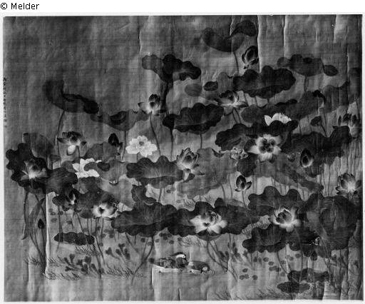 auf Seide gemalt mit Einfassung aus weißem Brokatstoff