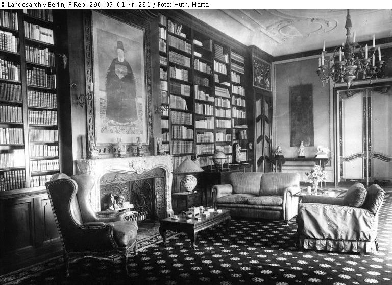 Das mit schmalen Leisten gerahmte Rollbild in der Mitte der Längswand des Bibliothekszimmers in kräftigem ornamentierten Rahmen eingelassen. – Siehe Abb. von ca. 1930: Landesarchiv Berlin, F Rep. 290-05-01 Nr. 231 / Foto: Huth, Marta.