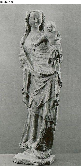 Stehend, auf dem linken Arm das halbbekleidete Knäblein, das das rechte Händchen auf die Brust der Mutter legt. Weicher Marmor. Vollrund. Sockelplatte ergänzt