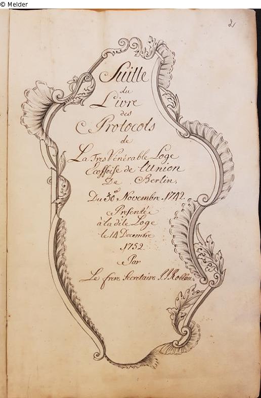 Mehrteiliges handschriftliches Buch mit Protokollen, Mitgliederlisten, Gesetzen und Statuten. In der Regel geführt vom Secretair der Loge Loge Ecossoise de l'Union in Berlin, Bruder J. J. Roblau.
