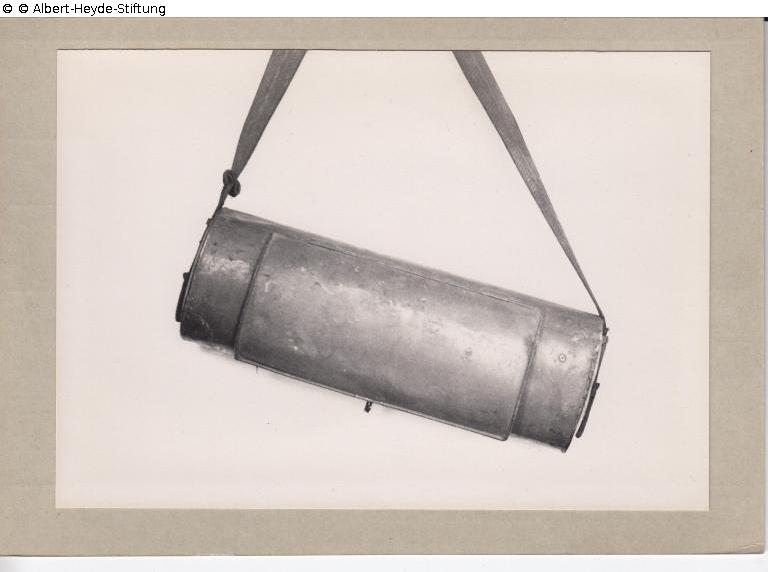 Botanisiertrommel zum Sammeln von Naturalien aus grünlackiertem Blech an breitem grünem Tragband.
