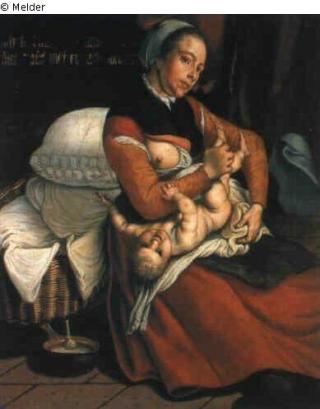 Mutter mit Kind, in ganzer Figur sitzend, mit entblößter Brust wird das nackte Kind trockengelegt;