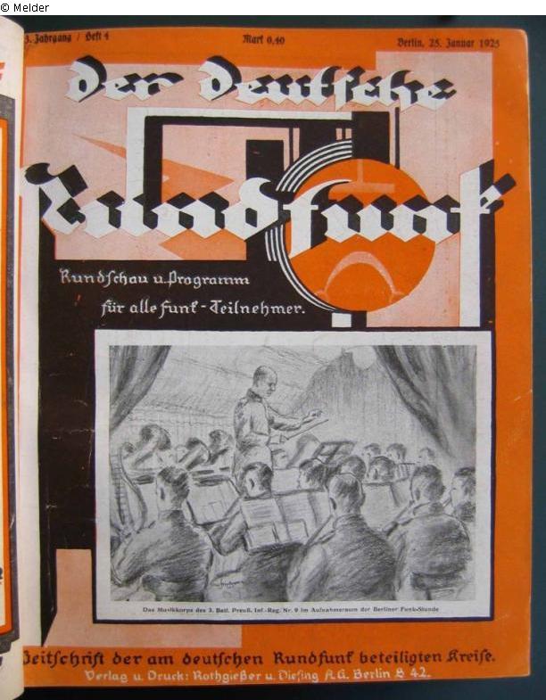 Suchmeldung | Einzelobjekt Musikkorps Lost Art-ID312909 Vorherige Weiter TitelMusikkorps Datierung1925ObjektartZeichnungObjektgruppeGrafikBeschreibung Veröffentlicht in: Der Deutsche Rundfunk, Heft 4/1925 Weiterlesen Weniger anzeigen Veröffentlicht seit2006 Kontakt Kontaktanfragen richten Sie bitte an das Deutsche Zentrum Kulturgutverluste.