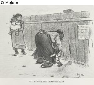 Mutter mit Kind, hinter Gartenhag, daneben stehend große Schwester mit Kleinem. Rechts unten bezeichnet: H. Zille