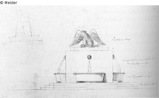 Zum Denkmal Friedrichs des Großen und dessen architektonischer Umgebung. [Die figürlichen Details vermutlich von J.G. Schadow, vgl.Kat. 2149. Zum Denkmal Friedrichs des Großen bearbeitete Gentz nacheinander drei Denkmalentwürfe zu den Ausschreibungen von 1791 (1. Entwurf), 1796 (2. Entwurf) und 1805 (3. Entwurf / Verschönerungsplan).]; Blatt 7; unausgearbeiteter Entwurf mit handschriftlichen Materialangaben; Sign./Bez.: Gentz