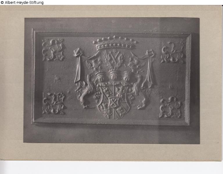 In gestuft profiliertem Rahmen von zwei Greifen gehaltenes viergeteiltes Wappen mit Herzschild (gekreuzte Zepter), darüber drei Bügelhelme und eine neunzackige Grafenkrone. In den Ecken quadratische Bandschleifen.