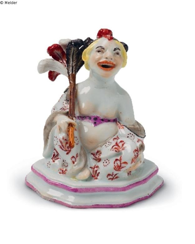 Schnorr von Carolsfeld: in ähnlicher Stellung wie Nr.25,26, auf gleichem Sockel. Die rechte Hand hält einen Wedel von schwarz, weiß und rot staffierten Straußenfedern an braunen Stiel, der auf der Schulter liegt. Der Kopf mit lachenden Gesichtsausdruck ist zurückgeneigt. Lippen rot, Augen braun, Brauen schwarz, Haarsträhne zitronengelb. Auf dem Kopf drei rot und schwarz staffierte Straußenfedern. Gewand weiß mit einem Muster eisenroter Zweige und Prunkrosetten, innen grau; der Bogenauschnitt am Nacken schwarz eingefaßt. Gürtel violett mit schwarzen Punkten. Sockel weiß mit purpurnen Streifen. Um 1725-30. Schwertermarke.