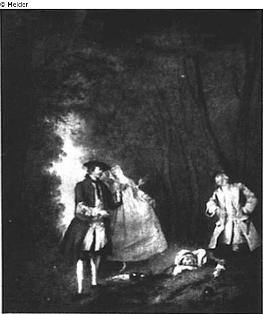 Auf einer Waldlichtung rauchender Herr in rotem Rock mit weißgekleideter Dame, die ein Glas hält. Rechts schlafende Frau und halb aufgerichteter Kavalier. Goldrahmen.