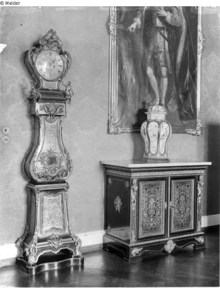 Ein Ganzfigurporträt eines Mannes, leicht nach rechts gedreht stehend und den Blick zum Betrachter gerichtet, in der Tracht eines Ritters des Hosenbandordens und der Perücke der „wigs“, mit einem langen, bis auf den Boden fallenden, hermelinbesetzem Umhang, darüber die goldene Ordenskette, unter dem linken Knie das Ordensband; die Linke mit abgespreizten Fingen unter der Brust haltend, die Rechte zeigend vor einem am linken Bildrand angeschnitten gezeigten, verzierten Rokoko-Tisch, auf dem der befiederte Hut eines Mitgliedes des Hosenbandordens liegt.