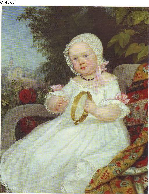 Porträt eines Kindes auf einer Gartenbank / Stuhl sitzend. Es trägt ein weißes Kleid mit rosanen Schleifen an den Armen und eine weiße Haube mit rosa Schleife und eine Halskette. In der linken Hand ein kleines goldenes Tamburin. Im Hintergrund ist die Kirche in Schönberg zu sehen. Über der Bank liegt eine bunt geblümte Decke. Im linken Hintergrund ist ein Kirche / Kapelle zu sehen. Gegenstück zu dem Porträt...