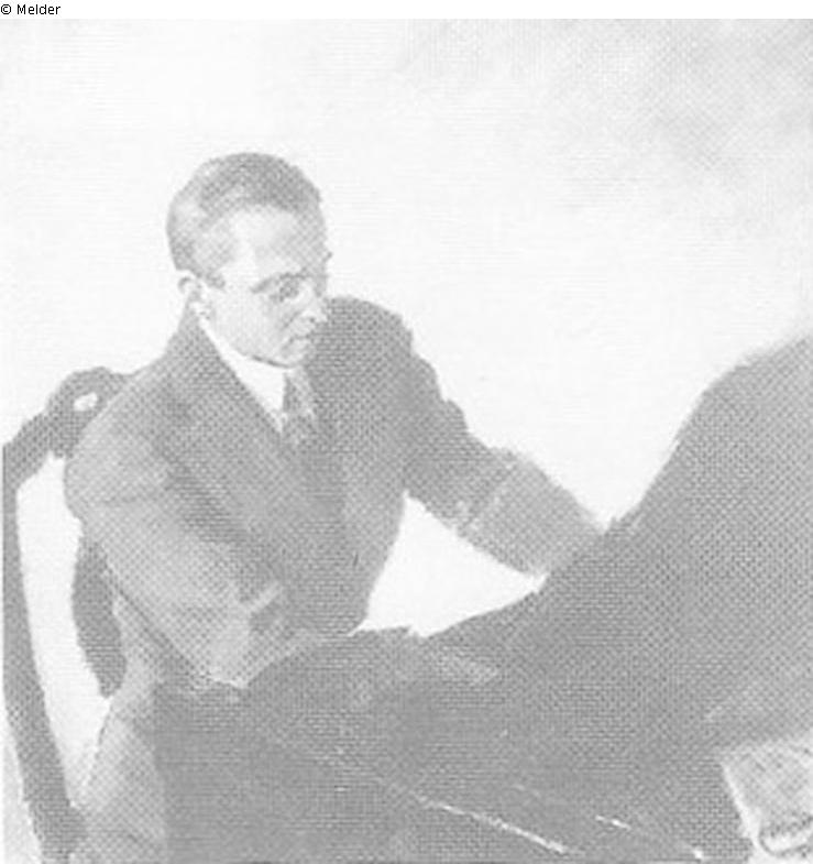 Links im Bild ist ein ca. 30jähriger Mann zu sehen, der an einem Flügel sitzt und spielt; der Pianist ist im verlorenen Profil zu sehen und z.T. vom Flügel verdeckt, der Flügel ist vom rechten Bildrand angeschnitten. Rahmen: Außenmaße: 124 x 113 cm; rückseitig vermutl. ein Klebezettel mit Angaben über Maler und Bildtitel, Kunstausstellung, Kaufpreis, und Ankaufdatum, erstellt von der Deputation für Kunstzwecke, Magistrat der Stadt Charlottenburg