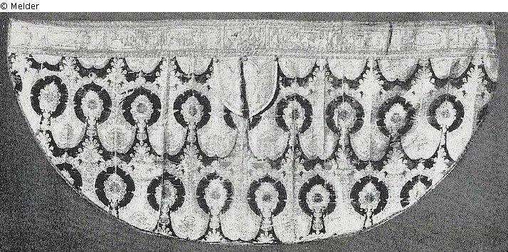 Doppelt geschorener roter Seidensamt mit Golduntergrund, in den Granatäpfeln frisierte Goldarbeit, die Cappa und die beiden Stäbe in bunter Reliefstickerei mit Silber und Gold.