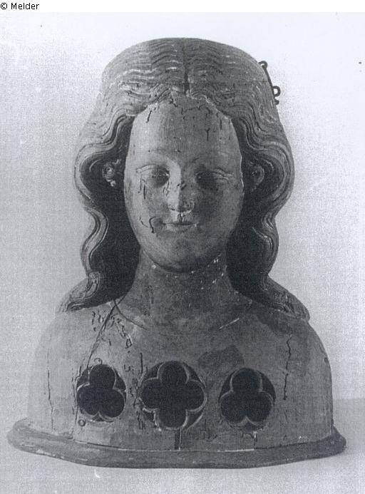 Der Scheitel zum Aufklappen. In der Brust drei Öffnungen, in der Mitte ein Vierpaß, rechts und links davon Dreipässe. Nur noch Kreidereste der ehem. Fassung, Holz, vollrund, Hälfte 45,5 cm