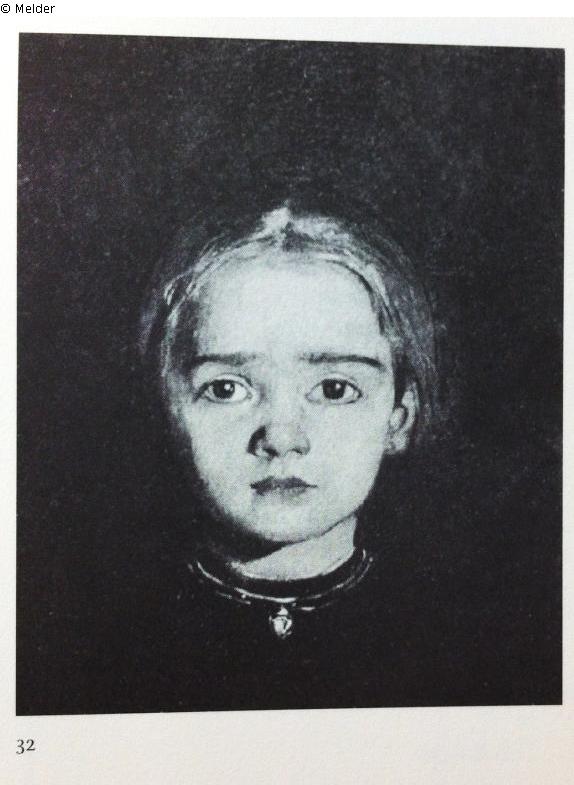 BDA: Rothaariger Mädchenkopf, in dem nur die Augen farblich aus dem sonst dunklen braun und rotbraun gehaltenen Hintergrund abstechen; En face, Hochformat.