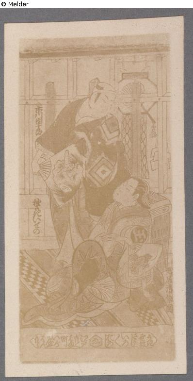 Oiran (hochrangige Prostituierte) Iseno (?) als Schauspielerin; Über ihr stehender Schauspieler mit Tengufächer; Hintergrund architektonische Staffage; Verlag Igaya. Hosoye (Einzelblatt, aufrechtes Format); Goldüberfang
