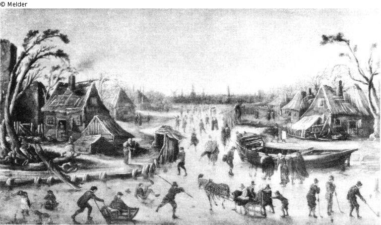On a canal, stretching from the front edge to the distance, with buildings on both shores are people skating and sledding. To the right are two boats, frozen into ice.