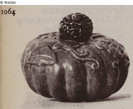 Kürbisförmig. Porzellan, Türkisfarbene Glasur, gespritzt.
