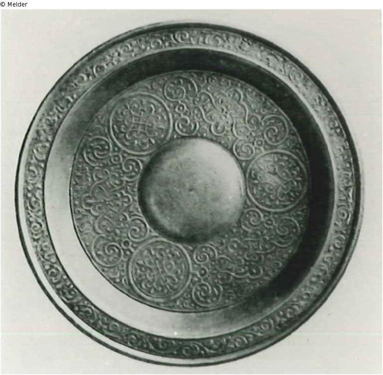 Metallkunst. Schüsselchen mit Verzierung in flachem Reliefguß. Um die glatte Mitte des Bodens Bandarabesken. Auf dem schmalen Rande Rankenornament. Arbeit des Hans Zatzer; frühes Werk des Meisters.