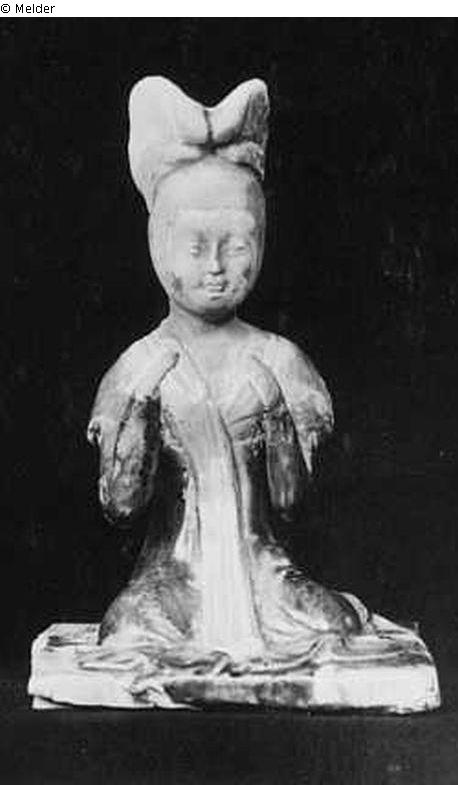 Frau, sitzend, rötlich-weißer Ton, teilweise glasiert in Braun, Geld und Grün; Imitation Tang-Periode (8. Jh.)