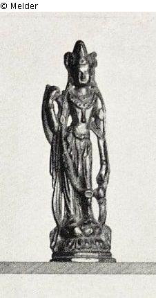 auf Lotossockel, mit Buddhafigürchen im Kopfputz und Fläschchen in der linken Hand. Feuervergoldet. In gelbem Stoffkasten. China. Tang.