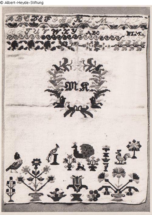 Vermutlich unvollendetes, hochrechteckiges Stickmustertuch. Im Zentrum ein Lorbeerkranz mit den Initialen "M. K.". Oben zwei Alphabete, im unteren Viertel verschiedene Blumen- und Tiermotive. Stickmustertuch (um 1840).