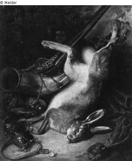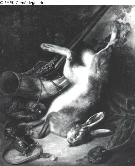 Tafelmalerei: Bild: Stilleben mit verwandten Gegenständen & Jagdbeute, Wild(-bret) & Nagetiere: Hase & Jagdhorn; Stilleben & Kadaver; Aas; Jagdbeute; Wild; Stilleben & Hase & Jagdhorn; Horn