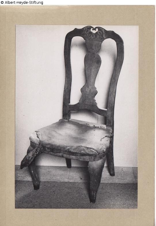 Stuhl in barocker Form. Die Rückenlehne im Mittelteil balusterartig geformt. Die vorderen Beine geschweift. Sämtlich Beine sekundär gekürzt.