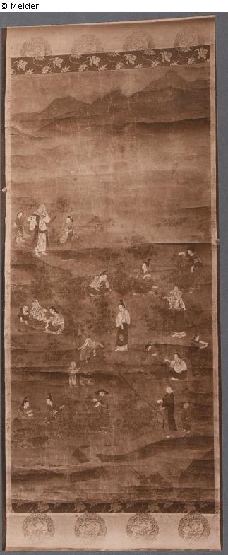 Aufsteigendes Terrain, das sich im Nebel verliert. Aus dem Nebel steigen die Spitzen und Rücken hoher Bergzüge auf. Am unteren Berghang sind Mädchen einzeln und in Gruppen mit der Teeernte beschäftigt. Ein Alter schaut auf seinen Stock gestützt der Arbeit zu. Von oben kommt ein vornehmer Herr mit seinen bewaffneten Begleitern den Hügel herab. Die Malerei auf bräunlicher Seide ist farbenfroh. Die Gewänder der Figuren sind mit Gold verziert. Gerahmt