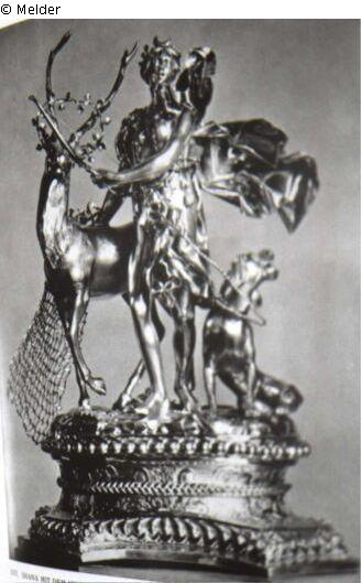 Teil einer 17-teiligen Tafelgarnitur: Diana mit dem Hirschen und Hund auf einem Sockel.