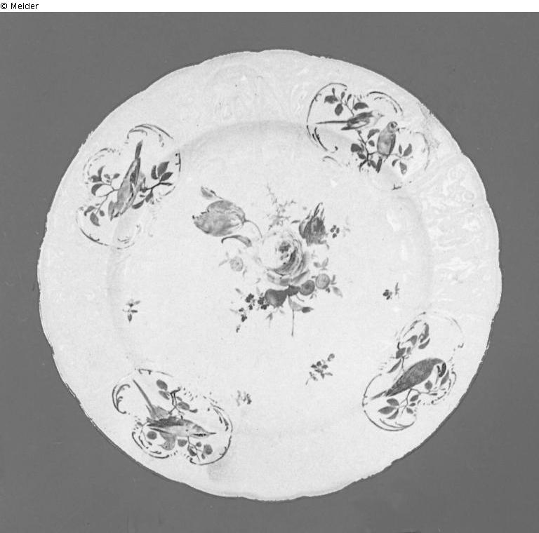 Flache Form mit Dulong-Reliefmuster; in vier goldgerahmten Kartuschen auf Randfahne und Kebe bunte Vogel- und im Spiegel mehrfarbige "Natürliche" Blumen- und Streublumen-Malerei. Randkante vegoldet.