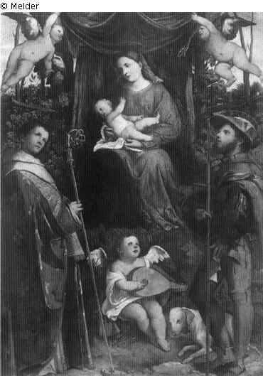 Tafelmalerei: Bild: Ludwig von Toulouse (von Anjou), Sohn des Königs von Neapel, Franziskanermönch und Bischof von Toulouse; mögliche Attribute: fleur-de-lis auf seinem Chormantel, Krone und Zepter & Rochus (Roch) von Montpellier, Bekenner und Pilger; mögliche Attribute: Engel (mit Salbgefäß oder Löffel), Hund (manchmal mit Brotlaib), (Fingerzeig auf) Pestbeule auf dem Schenkel, Pilgermuschel, -stab, -hut, und -tasche; Ludwig von Toulouse (Heiliger); Toulouse; Fransziskaner; fleur-de-lis; Chormantel; Zepter & Rochus (Heiliger); Arzt; Bekenner; Pilger; Engel; Salbe; Dose; Löffel; Hund; Laib; Pestseuche; Schenkel; Pilgerstab; Pilgertasche; Muschel (des Pilgers); Beule; Pilgerhut