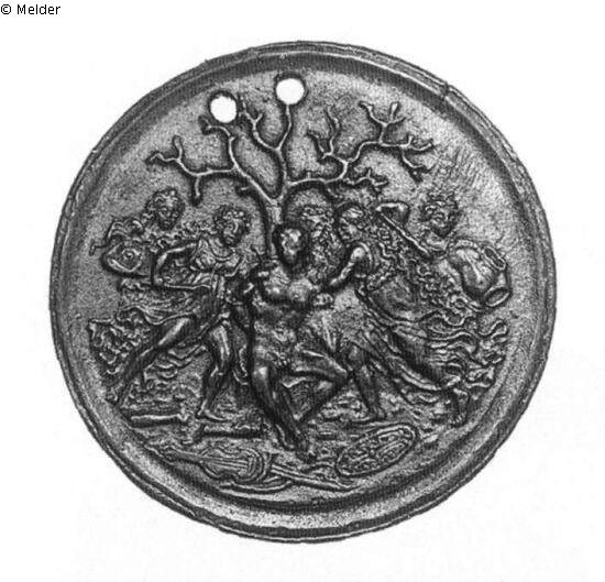 Runde Plakette, ringsum flaches Rahmenprofil, oben in der Mitte zwei Durchbohrungen. Orpheus sitzt mit rücklings an einen kahlen Baum gefesselten Armen auf einem Felsblock. Zwei Mänaden mit flatternden Haaren und Gewändern schlagen mit Keulen auf ihn ein. Dahinter sieht man zwei weitere Mänaden mit seinem Helm und seinem Panzer. Vorn auf dem Boden liegen Fiedel, Schwert, Bogen und Schild. Es existieren flache sowie konkave Exemplare für Schwertknäufe (Museum von Brescia, Kress Collection in Washington), auch mit breitem, ornamentiertem Rand in der Slg. Carrand des Museo Nazionale del Bargello in Florenz. Melioli (?) verwendete die Szene auf der Rückseite der Medaille auf Lucrezia Borgia von 1503. Christoph Weiditz entlehnte die rechte Mänade als Schildträgerin auf der Rückseite seiner Medaille auf Wolfgang Babel von 1525.