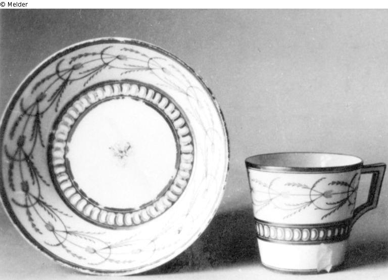 Spärliche Glockenblumenranken und Randvergoldung. Muschelartiger Ausschlag an der Obertasse. Tasse: Szeptermarke mit Goldpunkt, rote 3, Stempel 32. Untertasse: rote 2, Stempel 6.