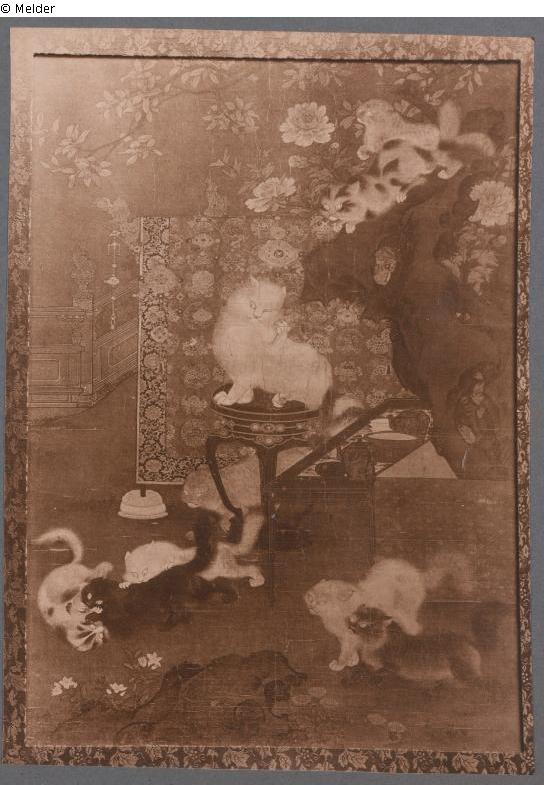 Chinesischer Garten mit Balustrade und Päonienstamm. Ein Tisch mit Teekanne und Schalen steht bereit. Im Hintergrund ist ein großer gemusterter Teppich. Vor dem Teppich thront auf einem Tabouret eine weiße, prächtige Katze in Art der Angora. Um sie herum entspinnt sich eine Balgerei zwischen den von allen Seiten herbeieilenden Katern.