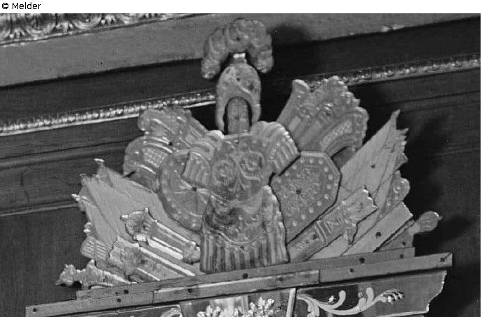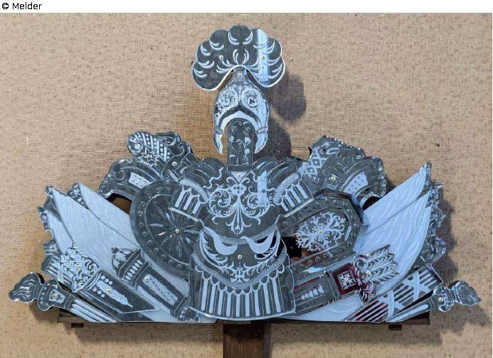 Trophäenaufsatz mit Wappenkrone und Waffentrophäe der Spiegelbekrönung eines Prunkspiegels