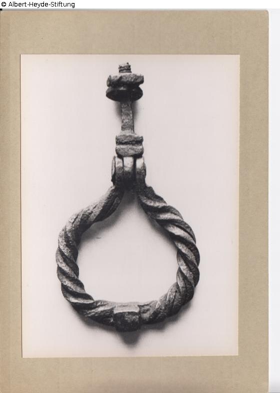 Tordiert geschmiedeter Eisenring mit Scharnier, Gewinde und Mutter.