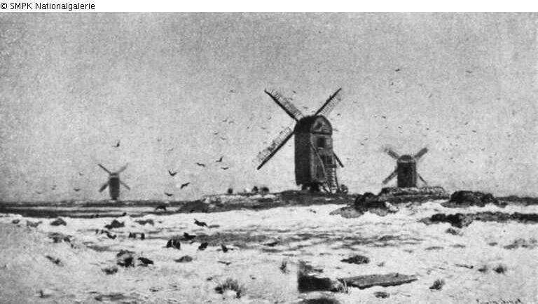 Tafelmalerei: Bild: Windmühle in einer Landschaft & Winterlandschaft; Landschaft, die den Winter bezeichnet (bei der Einteilung des Jahres in vier Jahreszeiten) & Schnee