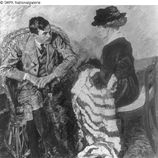Tafelmalerei: Bild: Unterhaltung, Konversation, Dialog; Konversationsstück & Mutter und Sohn bzw. Söhne (Familiengruppe) & auf einer Erhebung sitzen & übereinandergelegte Hände & auf einer Erhebung sitzen (weibliche Figur) & Lehnstuhl, Sessel & Stuhl