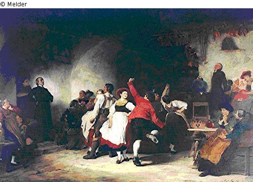 Tiroler Wirtsstube, vier Paare tanzend, Pfarrer schaut strafend, zwei zusehende Alte und ein Paar in der Ecke, Maiskolben an der Decke; Hauptbild des Meisters; signiert
