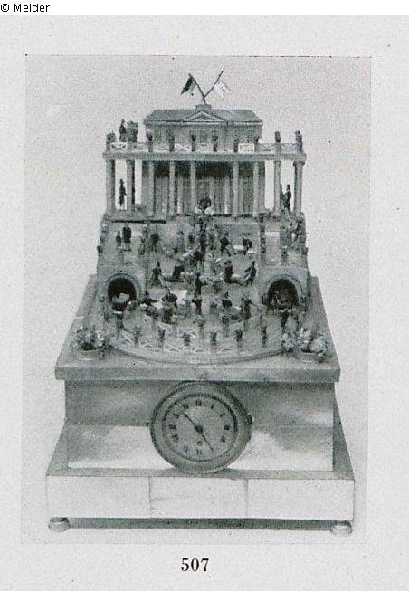 Wiener Kuriosität aus der Empirezeit: Auf rechteckigem Unterbau aus Perlmutter, geschmückt mit goldener Uhr, erhebt sich terrassenförmig eine Vergnügungsstätte und Gesellschaftshaus - alles aus Perlmutter mit vergoldetem Silberzierat. Durch einen Tunnel fahren, vom Uhrwerk getrieben, zwei Wagen. Zahlreiche Besucher in Miniaturformat beleben die Terrassen.