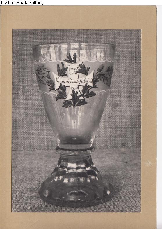 Kelch (in Hilfsmodel geblasen) aus farblosem Glas, der massive Rundfuß steigt steil auf und bildet gleichsam den Schaft, längs facettiert, angesetzt über einer Ringscheibe mit kleinen, geschliffenen Oliven eine hohe, sich becherförmig weitende Kuppa. Die Wandung ist umlaufend mit einer breiten Zierborte in farbiger Emailmalerei von Hand dekoriert, die auf der Schauseite das Eiserne Kreuz mit Eichenlaub trägt; darauf die Widmung "Vivat / mein / König und mein Vaterland / 1814", Mündungsrand verwärmt.