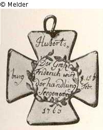 Ein weiß emailliertes Kreuz mit der Inschrift: "Der Große Friderich wird der Handlung Seegen geben / Und durch den Frieden spürt Mercur ein neues Leben". Die Kreußbalken tragen die Inschrift: "Hubertusburg d. 15ten Febr. 1763 / Berlin. Petersburg. Wien. D